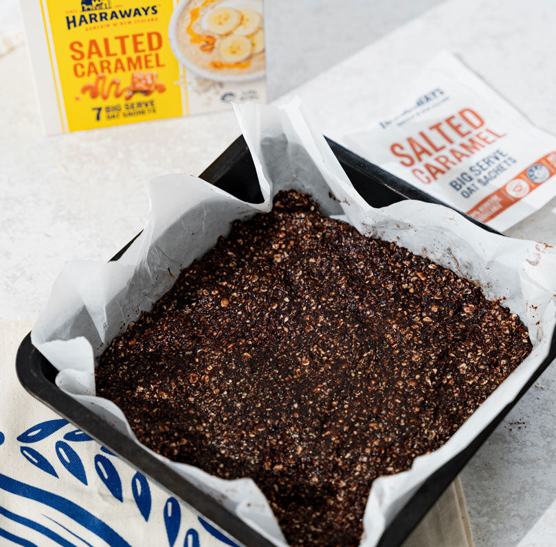 Easy Chocolate Oatmeal No-Bake Bars with Harraways Salted Caramel Oats! Sweet, chewy, and the perfect snack or treat.
